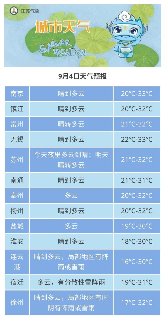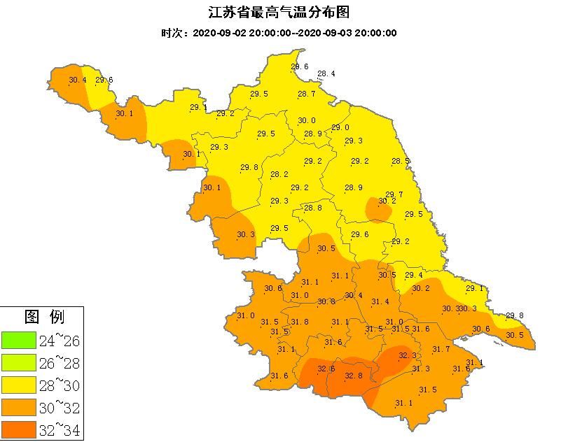 不过进入九月也到了夏秋交替的时候,白天的最高气温很难再上35℃,今天全省气温最高宜兴,32.8℃,并且有近一半的地方最高气温在30℃以下。