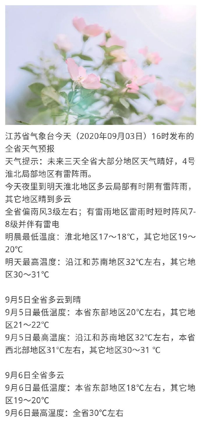 今天夜里到明天淮北地区多云局部有时阴有雷阵雨,其它地区晴到多云,全省偏南风3级左右;有雷雨地区雷雨时短时阵风7-8级并伴有雷电,明晨最低温度:淮北地区17~18℃,其它地区19~20℃,明天最高温度:沿江和苏南地区32℃左右,其它地区30~31℃。