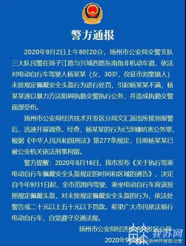 9月2日夜,扬州市公安局经济开发区分局发布通报称,9 月 2 日上午 8 时 20 分,扬州市公安局交警支队三大队民警在扬子江路与兴城西路东南角非机动车道,依法对电动车驾驶人杨某某(女,30 岁,仪征市刘集镇人)未按规定佩戴安全头盔行为进行处罚,引起杨某某不满,杨某某遂以暴力方式阻碍执勤交警执行公务,并造成执勤交警面部受伤。