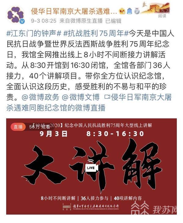 早上八点半,侵华日军南京大屠杀遇难同胞纪念馆推出的线上8小时不间断接力讲解活动就开始了,从清晨至傍晚,用语言和镜头让大家全面认识这段历史,悼念牺牲的同胞,感受胜利的不易与和平的珍贵。