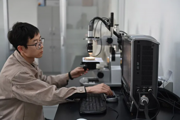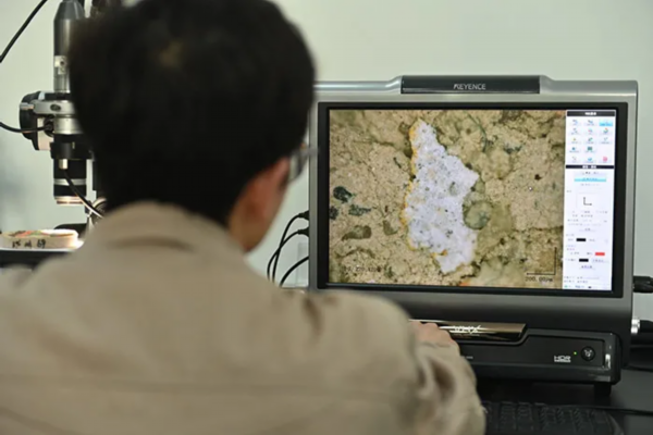 工作人员利用便携式数码显微镜观察评估壁画模拟试快病害修复效果(受访单位供图)
