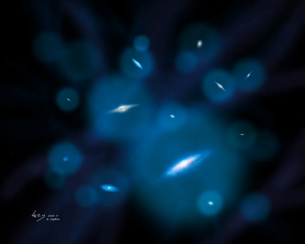 宇宙中约85%的物质成分是暗物质,其物质属性与组成恒星、行星以及我们人类世界的普通物质截然不同。这些暗物质受引力影响而塌缩,形成的结构体被称为暗晕。普通物质的气体通过冷却,聚集于暗晕中心,从而形成璀璨的恒星、星系以及整个光明的世界。