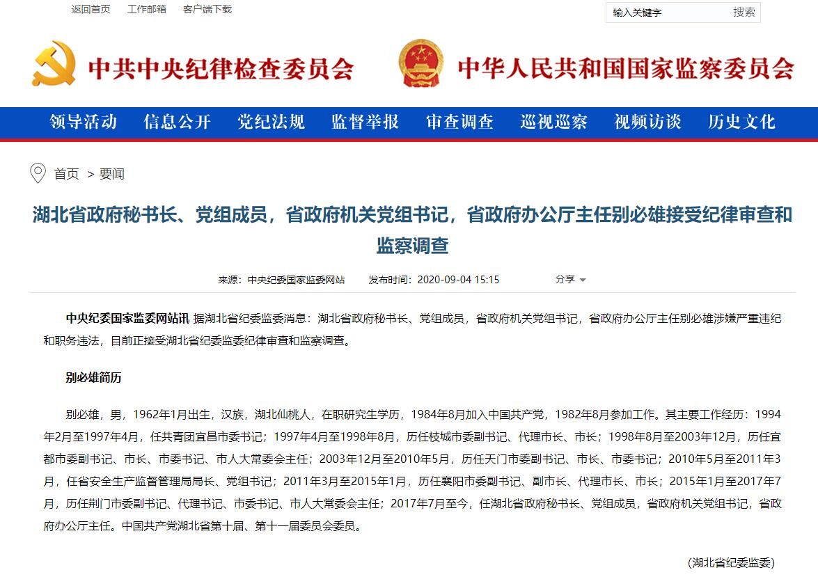 中央纪委国家监委网站讯 据湖北省纪委监委消息:湖北省政府秘书长、党组成员,省政府机关党组书记,省政府办公厅主任别必雄涉嫌严重违纪和职务违法,目前正接受湖北省纪委监委纪律审查和监察调查。