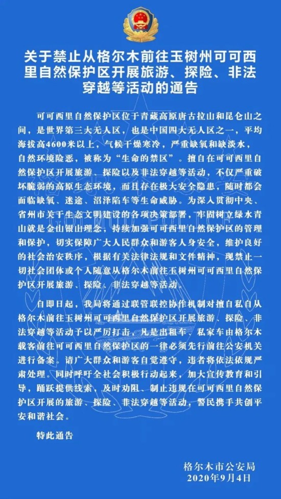 今天(9月4日),青海格尔木警方发布《关于禁止从格尔木前往玉树州可可西里自然保护区开展旅游、探险、非法穿越等活动的通告》,其中提到,禁止一切社会团体和个人随意从格尔木前往玉树州可可西里自然保护区开展旅游、探险、非法穿越等活动。
