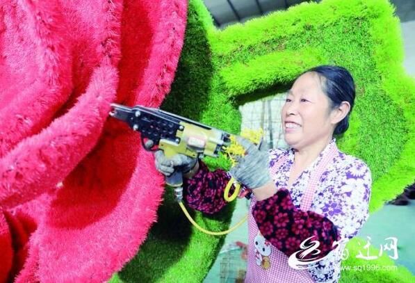沭阳县钱集镇大南村村民孙贵香是低收入农户,在镇村干部的帮助指导下,她学会了仿真花工艺品制作技术,现在在一家工艺品公司务工,月收入近3000元。