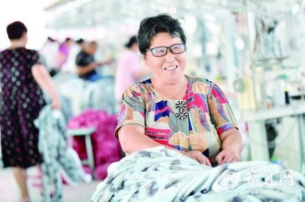 9月1日,在泗阳县爱园镇朱家圩村的苏润服饰有限公司车间里,64岁低收入户李秀明正在生产睡衣。她告诉记者,自从家门口建了工业园区,解决了她的就业难题,凭着勤劳的双手,日子越过越称心。