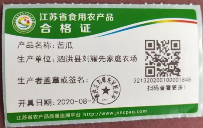 记者拿手机扫一张泗洪县刘耀先家庭农场8月21日开具的苦瓜的食用农产品合格证上的二维码,该产品从田间到上市的所有信息一目了然。据泗洪县农业农村局副局长颜崇宝介绍,食用农产品合格证由生产者自行开具,至少包含食用农产品名称、重量(数量)、种植(养殖)生产者信息(名称、产地、联系方式等)、开具日期和承诺声明等信息,是上市农产品的“身份证”、生产者的“承诺书”和农产品质量安全的“新名片”。