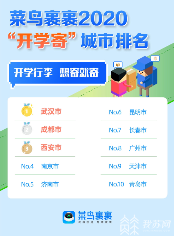 经过“史上最长”的假期,全国高校陆续迎来开学季。00后大学生更多选择轻松出行,人未到,行李已经寄到学校。菜鸟裹裹“开学寄”数据显示,武汉、成都、西安等城市大学生报到最踊跃。