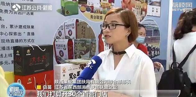 江苏省东西部消费扶贫联盟企业、陕西果业集团扶风有限公司综合部部长白苗说:“我们打算开30家门店,把我们陕西更好更优质的农副产品带到江苏。”