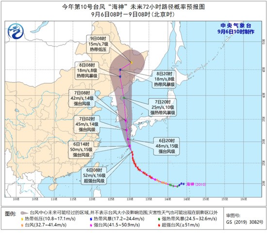 9月6日8时,第10号台风“海神”(超强台风级,16级,52米/秒)位于日本九州岛偏南方约600公里的洋面上。中央气象台预计,“海神”将以每小时30公里的速度向偏北方向移动,强度缓慢减弱,将于7日上午登陆韩国南部沿海(38~42米/秒,13-14级,强台风级或台风级),8日凌晨将移入我国吉林省(18~20米/秒,8级,热带风暴级)。8日晚上移入黑龙江省,并变性为温带气旋。