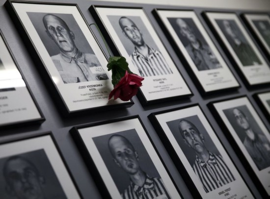 2016年1月27日,在波兰奥斯威辛-比克瑙集中营旧址,遇难者照片墙上插着一枝花。(新华社/路透)