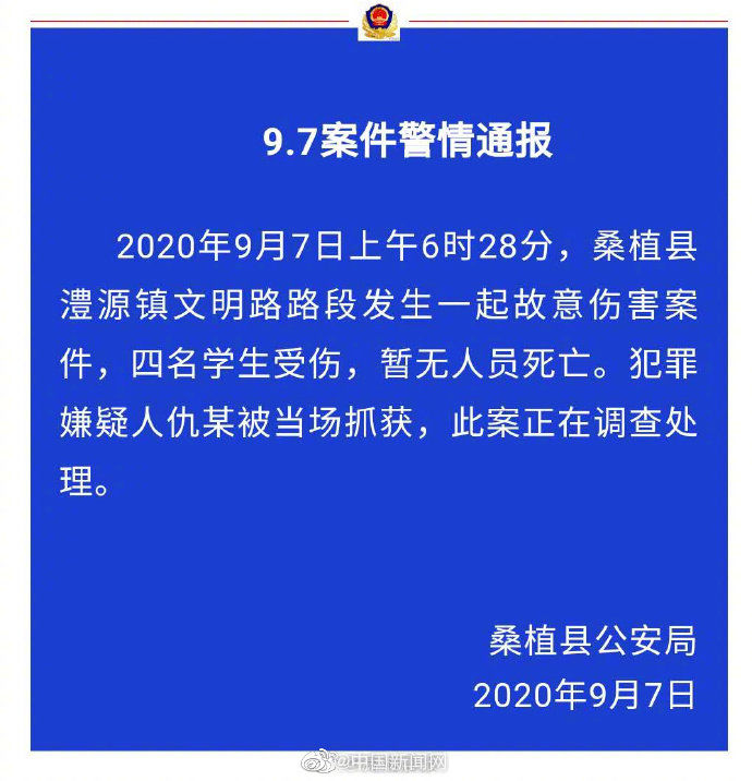 9月7日早上8点左右,在张家界桑植十一中学附近,一名男子持刀行凶,现场有学生受伤。9月7日上午桑植县委县政府官方通报,9月7日上午6时28分,桑植县澧源镇文明路路段发生一起故意伤害案件,四名学生受伤,暂无人员死亡。犯罪嫌疑人仇某被当场抓获,此案正在调查处理。张家界检察微信消息,目前,市、县两级检察机关已提前介入、引导侦查,该案正在进一步侦办中。