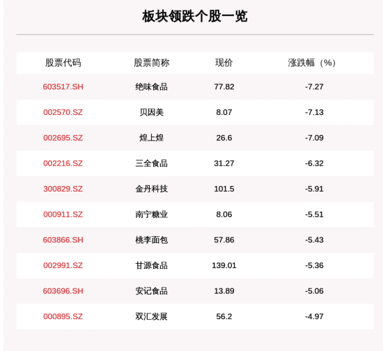 每经AI快讯,食品饮料板块走弱,板块内70只下跌,2只平盘,13只上涨,绝味食品、贝因美、煌上煌分别跌7.27%、7.13%、7.09%。