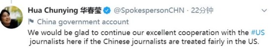 华春莹接着提到:“CNN记者和其他美国记者的签证延期申请正在处理中,在此期间他们可以继续没有任何问题的在这里生活和工作,我们已明确告知这些记者。如果中国记者在美国受到公平对待,我们很高兴继续与美国记者保持良好的合作。”