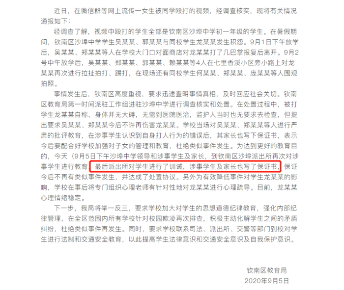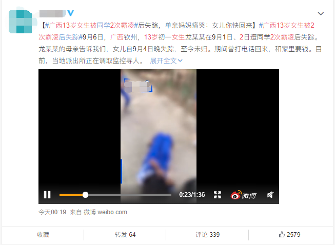 荔枝新闻注意到,霸凌事件发生后,当地教育局于9月5日发布情况通报,称已对三名打人学生进行了训诫,并由学生和其家长出具保证书,保证不再有类似事件发生,被打女孩情绪平稳。然而9月7日,被打女孩的母亲在接受媒体采访时称,自己的孩子已失踪两天,期间曾经打电话给自己要钱。媒体报道称,孩子母亲哭诉:“孩子你快回来。”