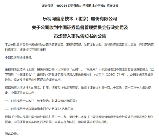 证监会拟决定:对乐视网责令改正,给予警告,并处以60万元罚款;对乐视网责处以募集资金百分之五即2.4亿元罚款。