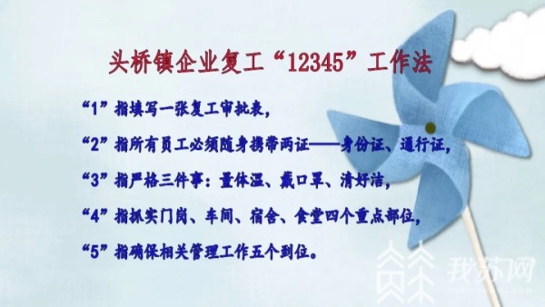 面临疫情防控和经济发展的大考,头桥镇全力保障医械企业复工生产,他们总结出“12345”工作法。“1”是一张《复工审批表》,企业实际生产内容、员工人数都得写得清清楚楚。“2”是“两张证”,员工必须持身份证和通行证出入厂区。“3”是“三件事”,量体温、戴口罩、消好毒。“4”是“四个部位”,重点防控门岗、车间及办公区、宿舍、食堂等四个重要部位。“5”是“五个到位”,确保责任人到位、方案到位、物资到位、安全生产到位、宣传到位。这套“12345”工作法后来在全区范围内推广。