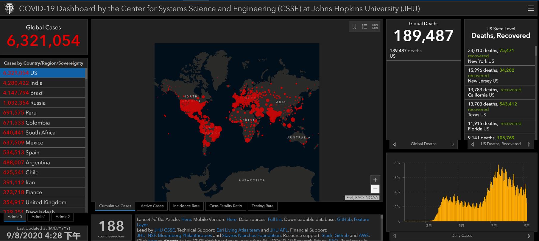 根据美国霍普金斯大学数据,截至美东时间8日16时28分,美国全国新冠肺炎确诊病例数达到6321054例,死亡病例达189487例。与24小时前相比,新增确诊病例约24000例,新增死亡病例约375例。