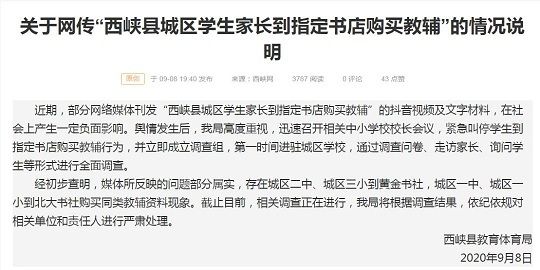 9月8日,河南南阳市西峡县教育体育局通过西陕网发布了关于网传“西峡县城区学生家长到指定书店购买教辅”的情况说明。全文如下: