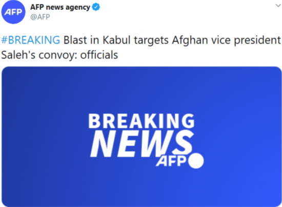 法新社9日消息称,阿富汗首都喀布尔发生爆炸,目标是阿富汗副总统的车队,至少造成2人死亡,副总统萨利赫没有受伤。(海外网 张琪)