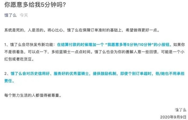 9日凌晨,饿了么对此事做出回应,饿了么副总裁刘歆杨称:“会尽快发布新功能,在结算付款时增加一个‘我愿意多等5分钟/10分钟’的小按钮,会对历史信用好、服务好的优秀蓝骑士,提供鼓励机制,即使个别订单超时,也不用承担责任。每个努力生活的人,都值得被尊重。”