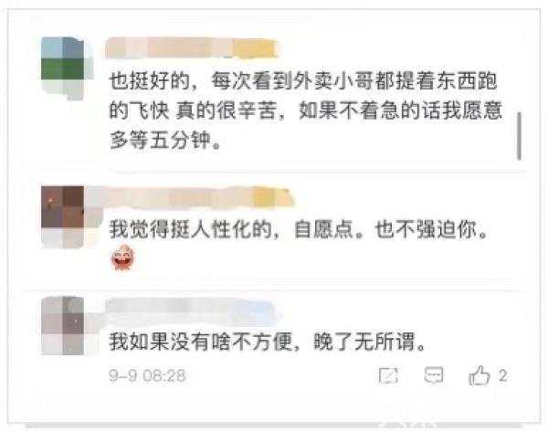 对于这一回应,部分网友给出了积极的应答,但是大部分网友对这一回应并不买账,他们留言表示,企业这种回应忽视了平台自身的问题,将责任转移给了消费者。但无论是哪一种观点,我们都能够看到绝大多数网友对于外卖小哥,还是温暖的。有网友表示:“我个人好像无法做什么,能做到的就是单子上尽可能写清地址、方向、路径,提示骑手不用着急。”也有网友说,作为客户,自己和很多人一样并不一味要求快,人需要的是可控感,只要系统准,客户就会做好时间预期,预期准比快更可靠。