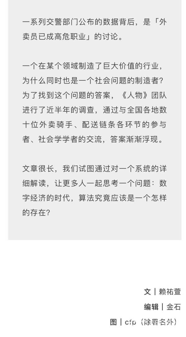 《外卖骑手,困在系统里》一文指出,外卖骑手在外卖系统的算法与数据驱动下疲于奔命,成了高危职业。记者通过走访发现,相同距离的配送时间逐渐缩短这件事的确存在,而写字楼拥挤的电梯、小区门禁等因素,再一次挤压了时间,所以大部分外卖小哥为了准时送达确保自己积分,只能在路上“和交警较劲,和红灯做朋友”。