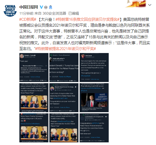 刚才仔细数了一下,短短约半个小时内,特朗普连发推特17条,内容几乎是一模一样的:特朗普被提名诺贝尔和平奖。