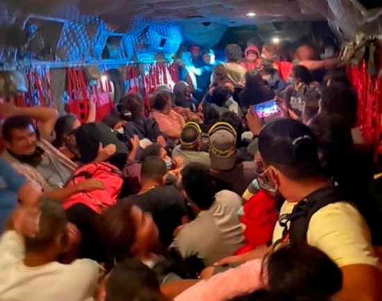 △6日凌晨,被救人员拥挤在直升机机舱内 图片来源:《纽约时报》