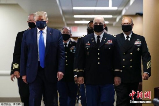当地时间7月11日,美国总统特朗普在访问一家军事医疗中心时,被拍摄到戴着口罩。