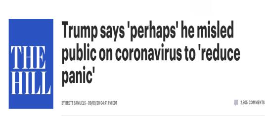 据美国《国会山报》9日报道,特朗普当天下午在白宫接受采访。有记者询问称,特朗普是否曾试图通过淡化新冠病毒严重性,以减少恐慌,从而误导公众。
