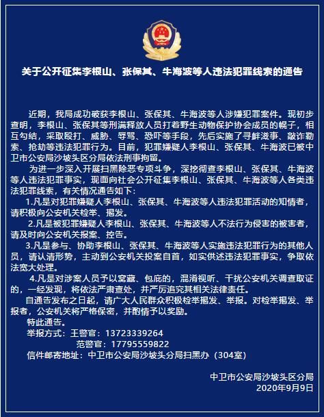 荔枝新闻讯 据宁夏中卫市公安局官方微信公号“平安中卫”消息称,近期,警方成功破获李根山、张保其、牛海波等人涉嫌犯罪案件。现初步查明,李根山、张保其等刑满释放人员打着野生动物保护协会成员的幌子,相互勾结,采取殴打、威胁、辱骂、恐吓等手段,先后实施了寻衅滋事、敲诈勒索、抢劫等违法犯罪行为。目前,犯罪嫌疑人李根山、张保其、牛海波已被中卫市公安局沙坡头区分局依法刑事拘留。