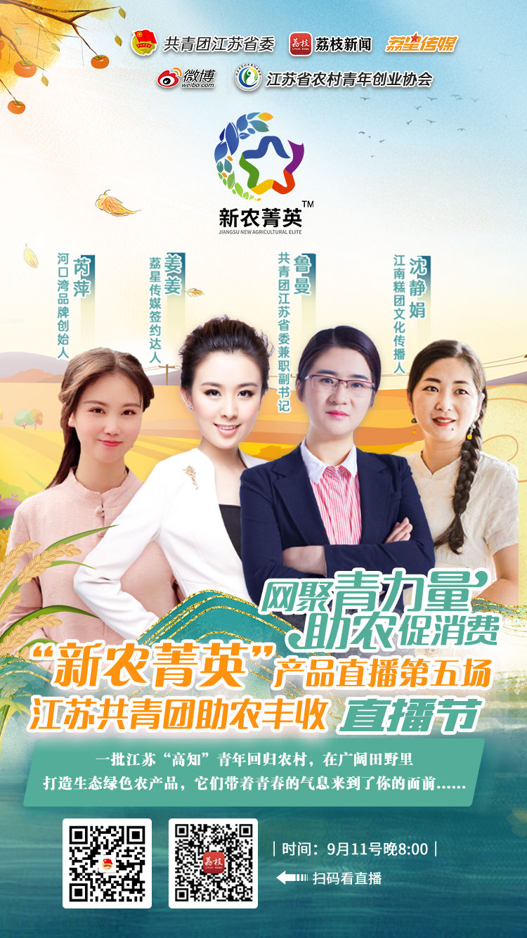 9月11日晚8点,由共青团江苏省委、荔枝新闻、荔星传媒主办,江苏省农村青年创业协会、新浪微博协办的第五期“新农菁英”产品直播——网聚青力量助农促消费·江苏共青团助农丰收直播节正式起航。9月22日我们即将迎来第三个“中国农民丰收节”,我国将每年的秋分设立为“中国农民丰收节” ,即是对古人智慧结晶的致敬与传承,同时也是当代人准确把握住时节规律,用现代思维点缀传统文明的表现。看直播,话一晚倾心倾情的美食之旅!(直播戳这里)