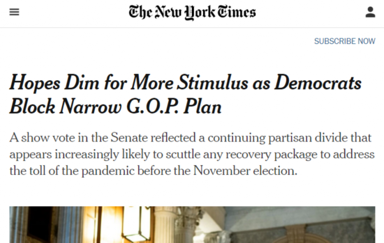 《纽约时报》报道,随着民主党人狙击了缩水版的共和党方案,美国出台新一轮疫情纾困措施的希望渺茫