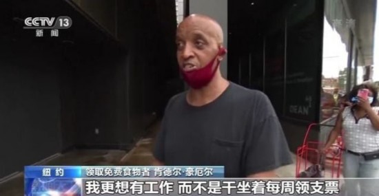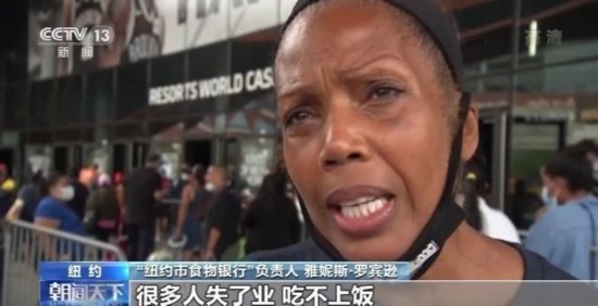 “纽约市食物银行”负责人 雅妮斯·罗宾逊: 很可悲,纽约人还在苦苦挣扎,很多人失了业,吃不上饭,孩子们也停课在家,吃不上学校提供的餐食。因此(对食物银行的)需求持续上涨,不幸的是,这样的日子看不到头。