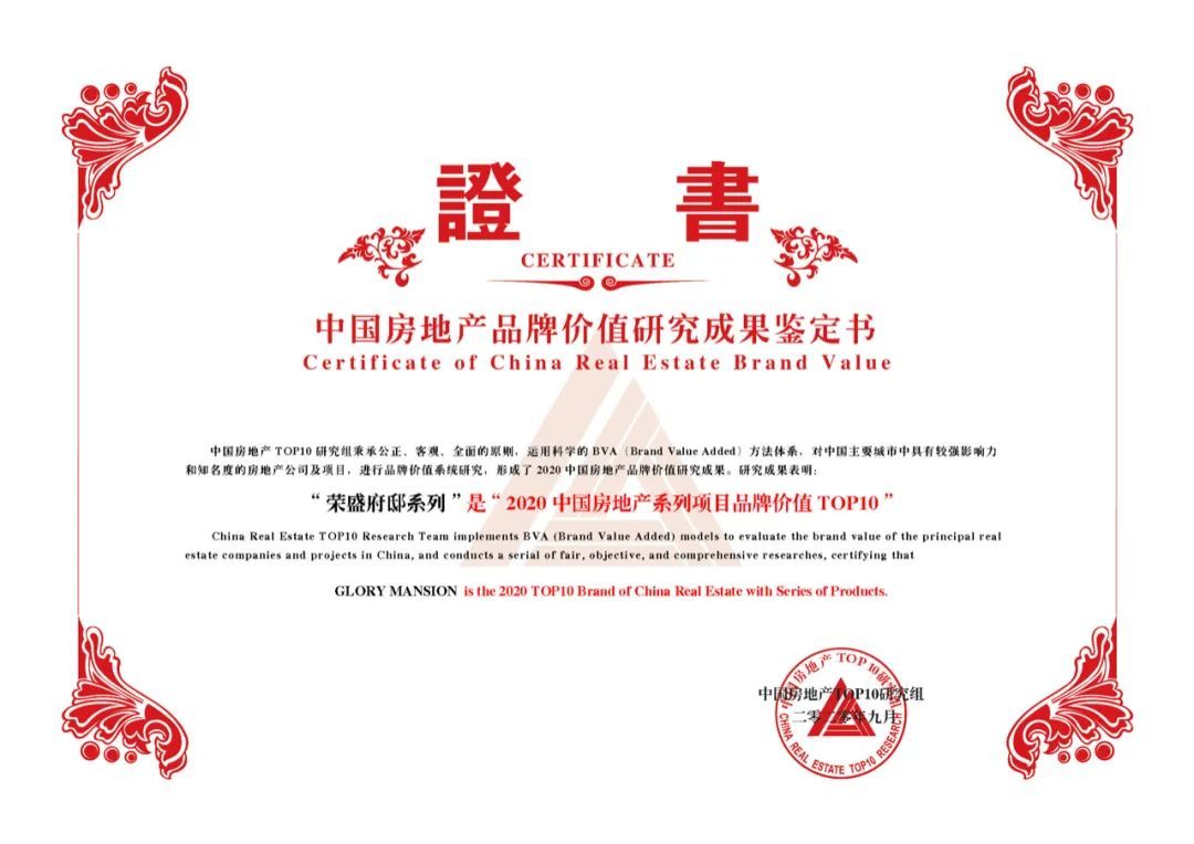 图:2020中国房地产住宅项目品牌价值TOP10证书