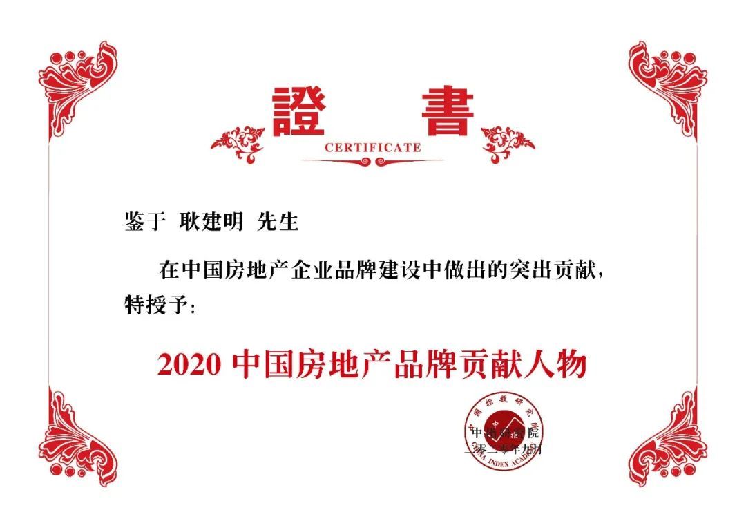 图:耿建明先生2020中国房地产品牌贡献人物证书