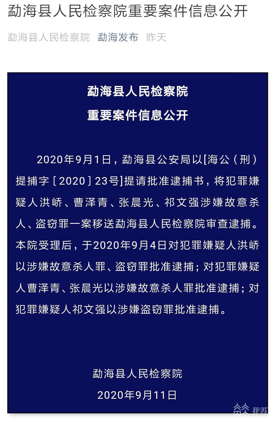 勐海县人民检察院受理后,于2020年9月4日对犯罪嫌疑人洪峤以涉嫌故意杀人罪、盗窃罪批准逮捕;对犯罪嫌疑人曹泽青、张晨光以涉嫌故意杀人罪批准逮捕;对犯罪嫌疑人祁文强以涉嫌盗窃罪批准逮捕。