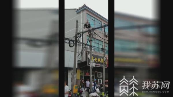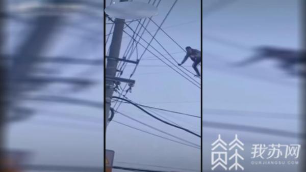 在现场,这名男子已经爬到了一根低压电杆顶部,双手抓着两根绝缘导线,双脚搭在两根导线之间,颤颤巍巍地向另一头爬去。而导线的另一头是10千伏高压线。虽然导线绝缘,但是杆塔上的金属接头是裸露在外的,一旦触及,后果不堪设想。情况十分紧急,当天下午6时左右,南夏墅供电所拉停了该男子所处的低压线路。武进消防救援大队在地面铺上安全气垫,防止该男子高空坠落。