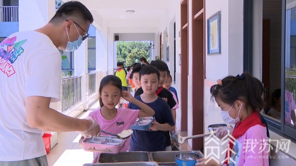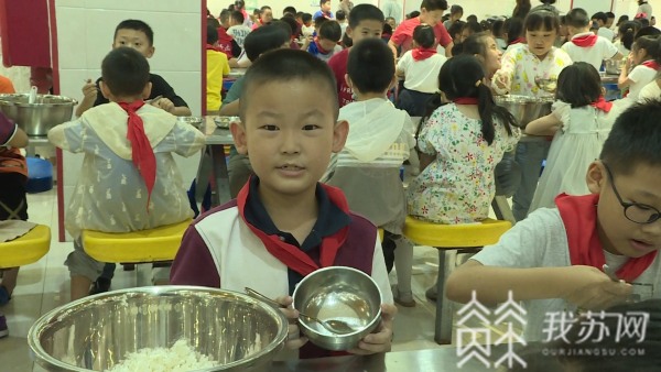 在宿迁市实验小学北校区,学校食堂会根据学生在校用餐人数变更炒菜分量,避免不必要的浪费。每次开饭前,由餐桌小组长为每一位成员盛饭,之后学生们才开始吃饭,全场秩序井然。