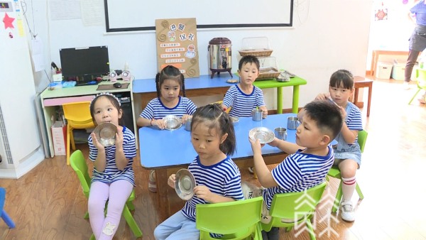 在镇江市京口区小牛津幼儿园的教室里,老师正在向懵懂的萌娃们讲解什么是光盘行动,告诉孩子们要节约粮食、拒绝浪费。到了吃点心的时间,孩子们来到餐桌旁边,自己动手取食物,自觉地取走一小份、吃完不够再拿。