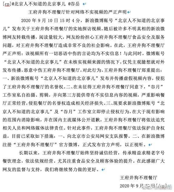 上述视频发布后不久,新浪微博账号“王府井狗不理店”就发布了一则声明,称@谷岳和@北京人不知道的北京事儿 发布、传播虚假视频内容,一切恶语中伤的言论均不实,侵犯了餐厅名誉权,餐厅已报警并将依法追究相关人员和网络媒体的法律责任。