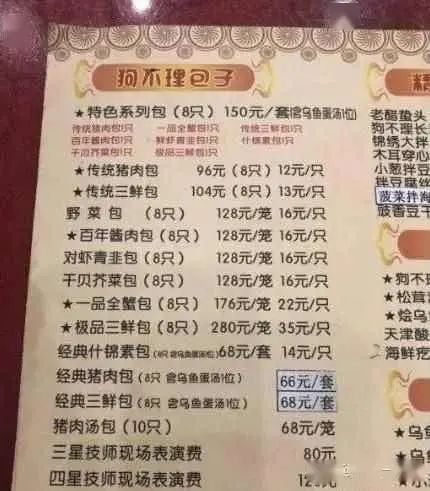 有网友晒出的狗不理包子某门店的价格列表显示,最传统的猪肉包要12元一只,多数包子的价格都维持在16元一只左右,而最贵的极品三鲜包竟然要35元一只。