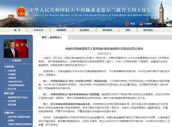 记者问:9月10日,英国伦敦金融城市议会通过一项动议称,注意到英国政府认为中方实施香港国安法违反《中英联合声明》,破坏香港高度自治;注意到英国政府为香港英国国民(海外)(BNO)护照持有者扩大居留权,金融城欢迎有关香港居民。中国驻英国大使馆对此有何评论?