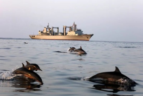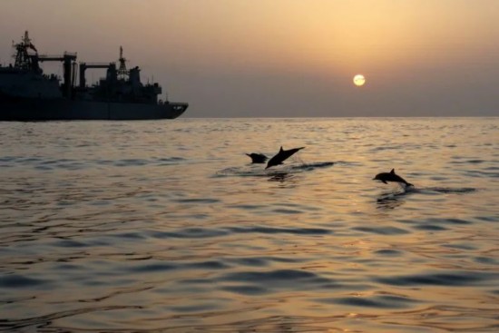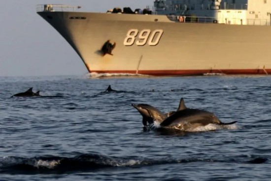据了解,中国海军赴亚丁湾索马里海域护航编队周围,经常出现编队舰艇航行时有成群海豚伴航、待机集结时有各类鱼群相伴的和谐场景。