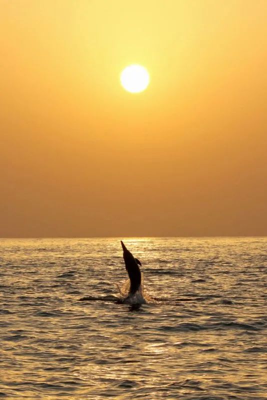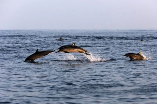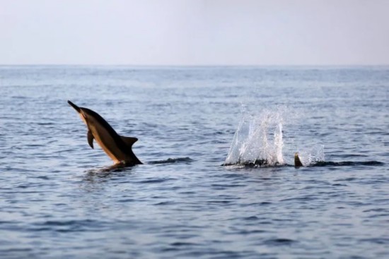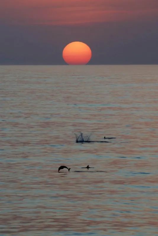 这些海豚一会儿如同大海的精灵,追逐玩闹,与军舰竞速,俏皮地在舰艏穿梭、两舷嬉戏;一会儿如同灵动的舞者,欢腾跳跃于海天之间,腾空、旋转,在阳光下洒落一身水花;一会儿又如同顽皮的孩子,忍不住好奇地贴近军舰,一窥究竟。平静的海面也因为这些海豚的穿梭,显得格外热闹。这群海豚一直伴随编队而行,直到夕阳西落才慢慢散开。