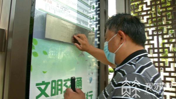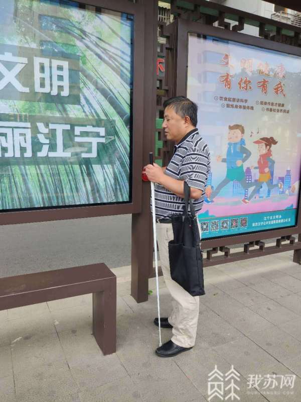 在南京江宁文靖路中前社区公交站,盲人李必忠正在触摸一块长方形的不锈钢钢板,钢板上印有盲文。