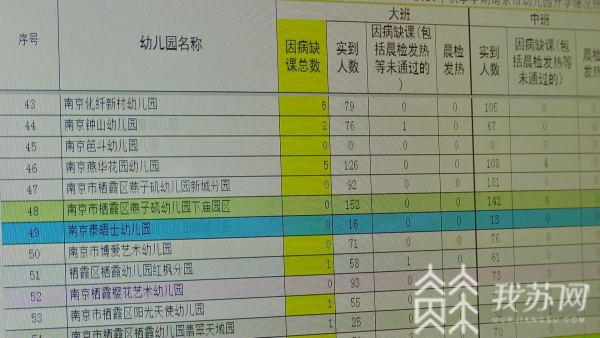 潘丽还核对了幼儿园的防疫物资储备情况,查看隔离室布置,查验当天的晨检记录。她介绍,按规定,各学校幼儿园要通过江苏省学生健康监测系统,报告每天学生因病缺课情况。疾控部门对包括新冠肺炎在内的所有传染病均实行严密监控,一旦发现病例立即介入,协助学校幼儿园把传染病控制在萌芽状态。