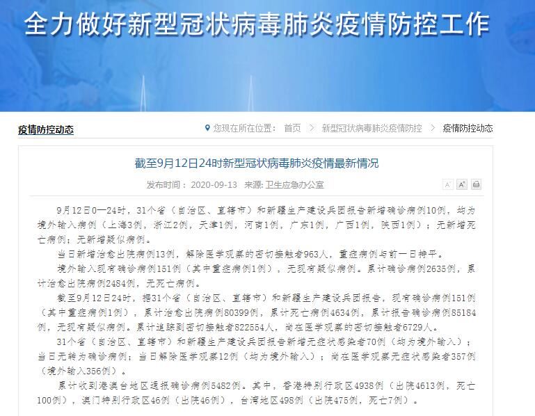 截至9月12日24时,据31个省(自治区、直辖市)和新疆生产建设兵团报告,现有确诊病例151例(其中重症病例1例),累计治愈出院病例80399例,累计死亡病例4634例,累计报告确诊病例85184例,无现有疑似病例。累计追踪到密切接触者822554人,尚在医学观察的密切接触者6729人。
