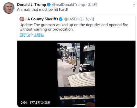 特朗普刚刚转发一则来自加利福尼亚州洛杉矶县治安官办公室的推特,怒骂视频中的枪手:“畜生一定会被狠狠惩治!”↓